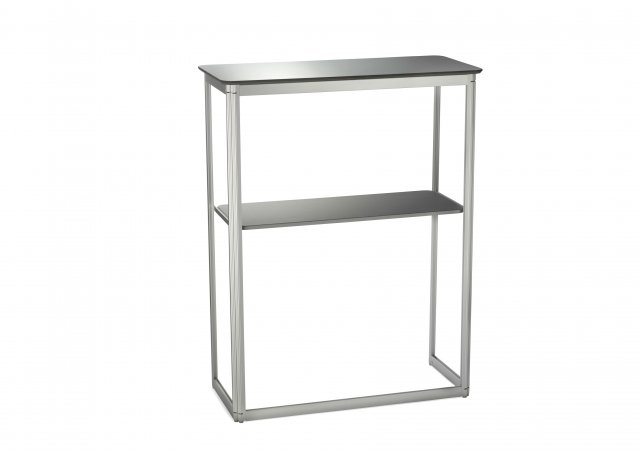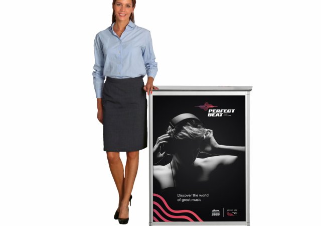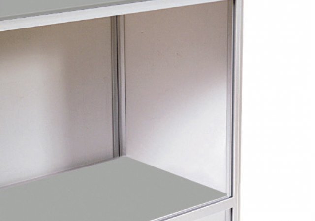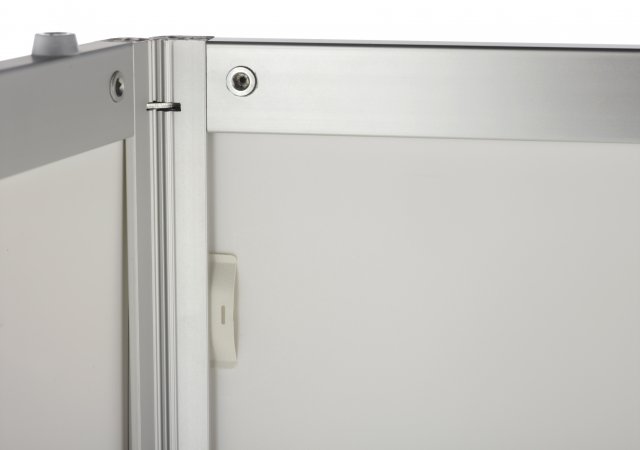 Die großzügige Frontfläche bietet ausreichend Platz für Logos, Botschaften oder Produktinformationen. Bei Bedarf können die Grafikplatten einfach ausgetauscht werden. Eine Innenablage schafft zusätzlichen Stauraum für Prospekte, Unterlagen oder persönliche Gegenstände.