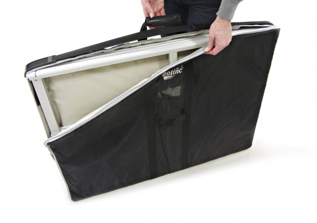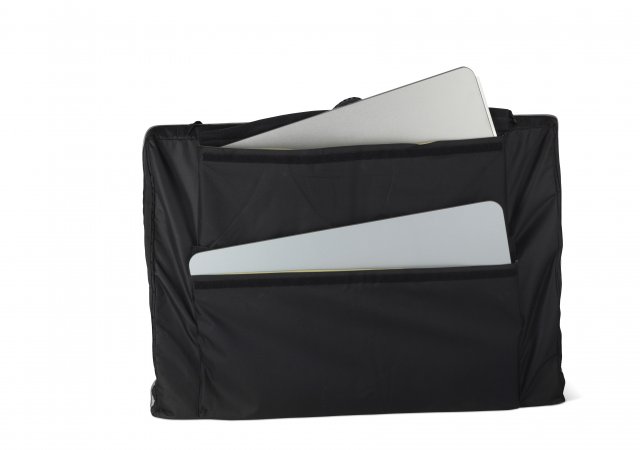 Zum Lieferumfang gehören der Thekenrahmen, die Arbeitsplatte, eine Innenablage sowie eine gepolsterte Transporttasche mit Schultergurt. Darin lassen sich alle Komponenten sicher verstauen und bequem transportieren.